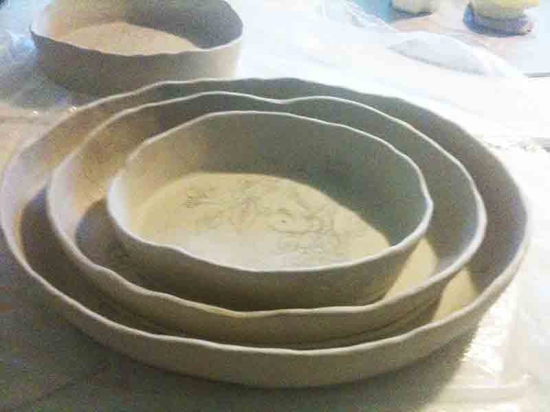 I got to work this weekend and made some new large stacking serving platters with mishima decoration. I like the mishima process A LOT! I used to carve or stamp of course, but wait to fill in color in the bisque stage. I like this more refined process - though it can be tricky.