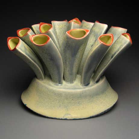 About Gwendolyn's work; I've found no picture to do her pieces any justice at all. The details in her shapes and forms are amazing; and the glaze can only be experienced first hand - it has a velvety lusciousness that would convert anyone - except that she talked about how challenging the glazes are. Her use of microcrystalline-glaze is as much a part of the overall result as the shape and form - a perfect example of a good marriage. Her process is "GLaborious"; such care and indulgence invested in each piece down to the minutest details.